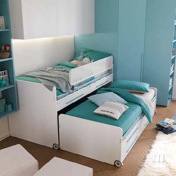 Кровать Space - это модульная система, представленная двумя спальными местами, ящиками для хранения вещей, и выдвижными письменными столами. Для верхней кровати предусмотрена откидная защита Web Split с ключом безопасности: защиту можно разблокировать, только активировав механизм фиксации, например, когда кровать нужно заправить.