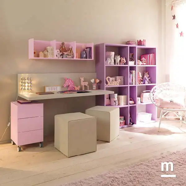 Хорошо организованная учебная зона необходима для того, чтобы избежать излишнего беспорядка и сосредоточиться на обучении. В этом решении есть все, что нужно: большой подвесной стол, книжная полка, подвесная полка и тумба на колесиках.